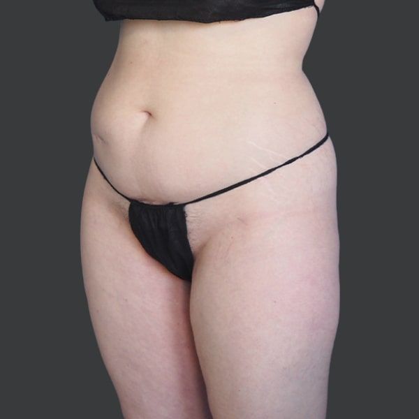 This patient is shown 1 year post-op from Liposuction of the abdomen, flanks, and outer thighs, along with an Abdominal Scar Revision.